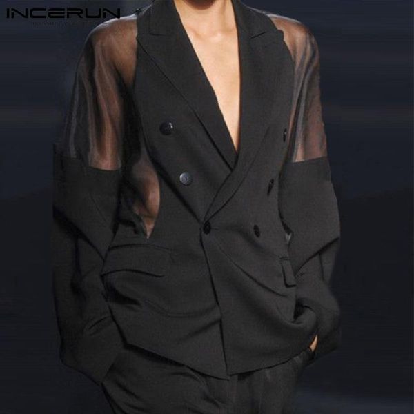 men's suits & blazers men blazer mesh patchwork see through streetwear double breasted lapel long sleeve outerwear fashion casual incer, White;black
