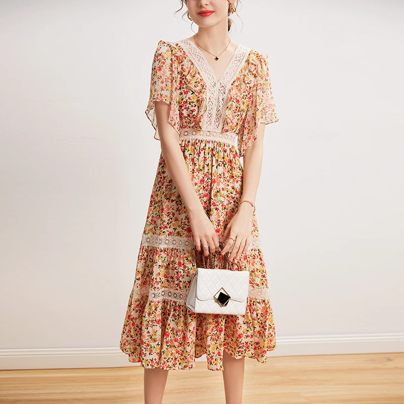 100% натуральный шелк женские платья сексуальный v-образный вырез вышивка с короткими рукавами кружевное платье в стиле пэчворк с принтом мно...