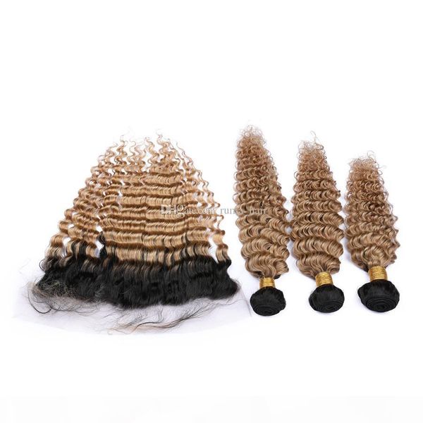 dark roots honey blonde бразильская пучки волос с фронтальная закрытие deep wave human hair two tone 1b 27 русый ombre virgin hair, Black;brown