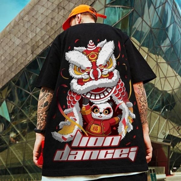 men's t-shirts summer lion dance round neck short-sleeved t-shirt tide big size chinese style panda couple shirts street wear cool top, White;black