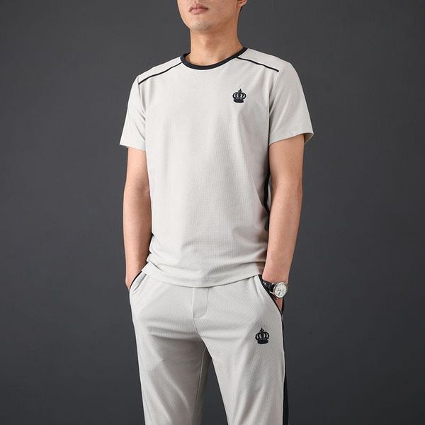 men's tracksuits 2021 summer slim breathable leisure suit embroidery stretch body round collar sport short sleeve two piece men, Gray