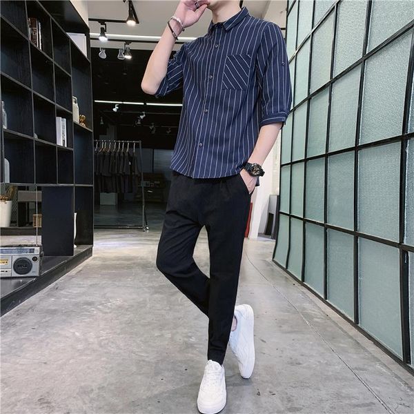 men's tracksuits -3xl tracksuit sets male 2021 3/4 sleeve striped shirt ankle pants loose two piece suit summer fashion casual set xxx, Gray