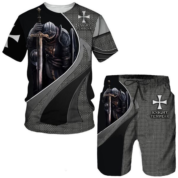 men's tracksuits knight templar 3d print t-shirt/shorts/suit cool short sleeve retro style streetwear two piece set summer tracksuit ou, Gray