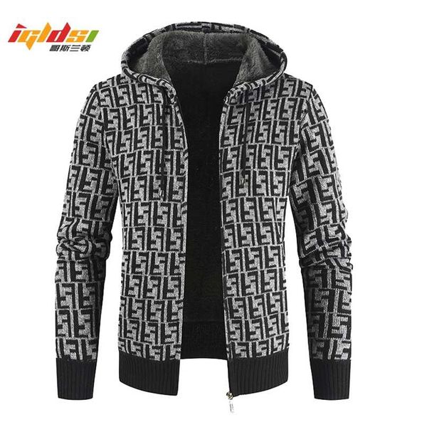 men's winter striped sweatercoat thick fleece warm jacket zipper wool hooded cardigan jumpers male long sleeve knitted sweaters 211221, White;black
