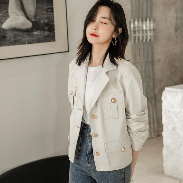 women's leather & faux 2021 sheepskin jacket autumn and winter ladies short korean white clothing, Black