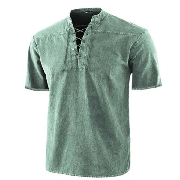 men casual shirts medieval retro lace-up v-neck cotton linen gothic short sleeve t-shirts plus size s-5xl275j, White;black