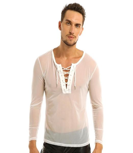 men lace up mesh see through long sleeve tshirt club wear costumes undershirts sheer fishnet transparent tees men4120864, White;black