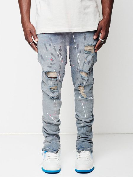 men s jeans side slit zipper paint slim fit cotton ripped denim pants autumn high street fashion knee abrasion light blue 230217