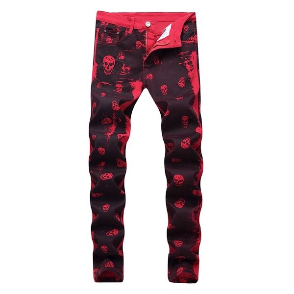 men s jeans waist size 28 42 casual skinny denim pants fashion skull slim red moto biker male printed long trousers 230228, Blue