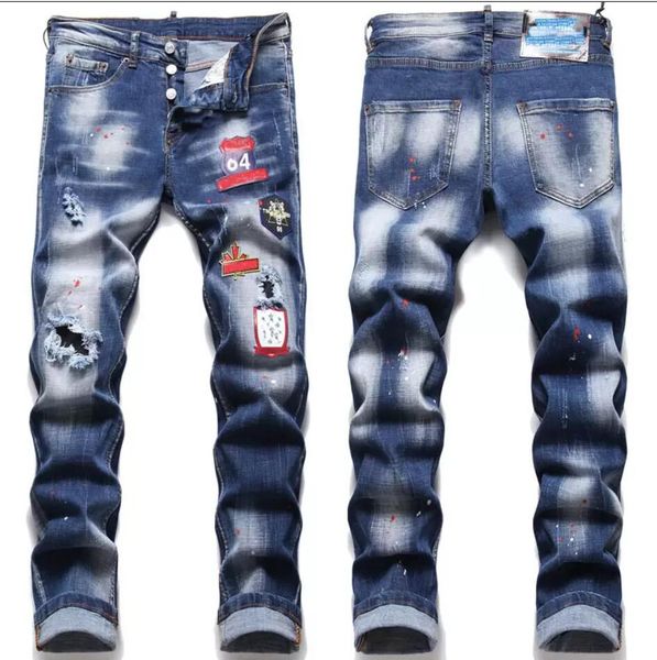 men slim fit straight leg jeans stretchy ripped badge skinny men's denim pants 5-pocket regular jean destroyed hole clothing pant hip h, Blue