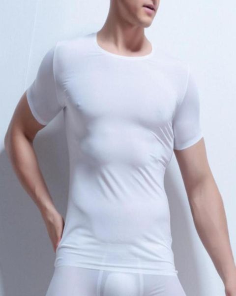 men slim tight tshirts compression tee fitness oneck solid short sleeve ice silk t shirt superthin sleep undershirt11715762, White;black