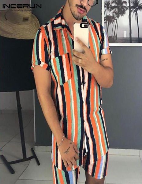 men039s tracksuits incerun summer men striped sets lapel short sleeve shirt shorts casual streetwear cotton beach mens hawaiian6435269, Gray