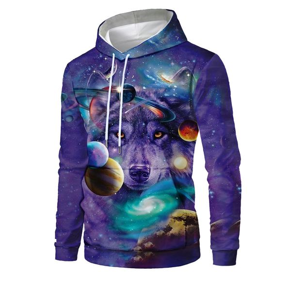 mens designer space wolf 3d digital printing pocket pullover sweater fashion hat hoodie, Black