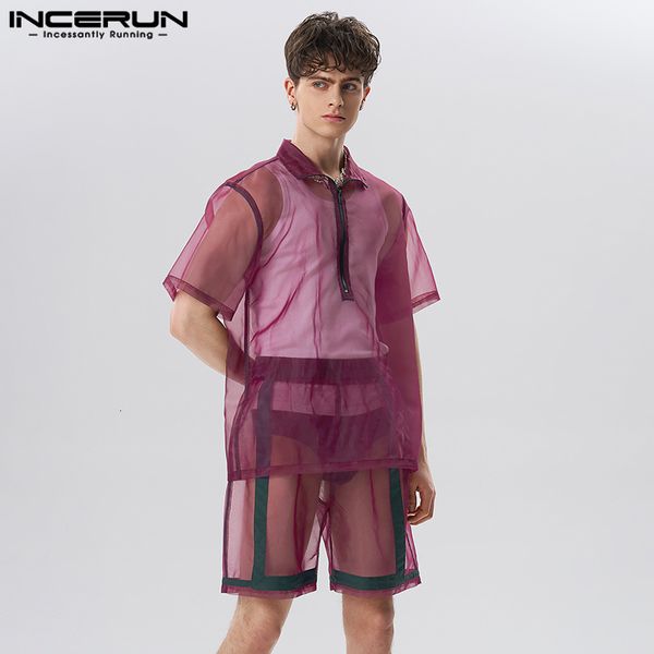 mens tracksuits men sets mesh patchwork streetwear see through short sleeve zipper shirt shorts 2pcs fashion men suits incerun 5xl 7 230419, Gray