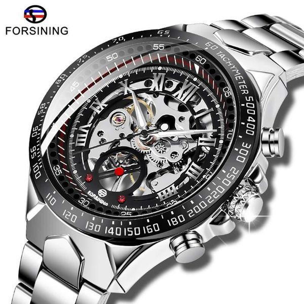 mens watches forsining skeleton luminous hands men mechanical watch stainless steel band transparent automatic hand wind wristwatches, Slivery;brown