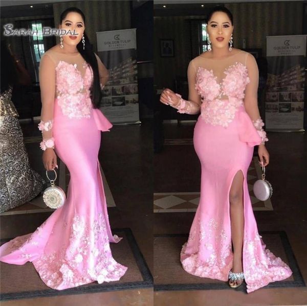 mermaid side split prom dresses sheer neck long sleeves satin evening gowns wear custom made5612420, Black