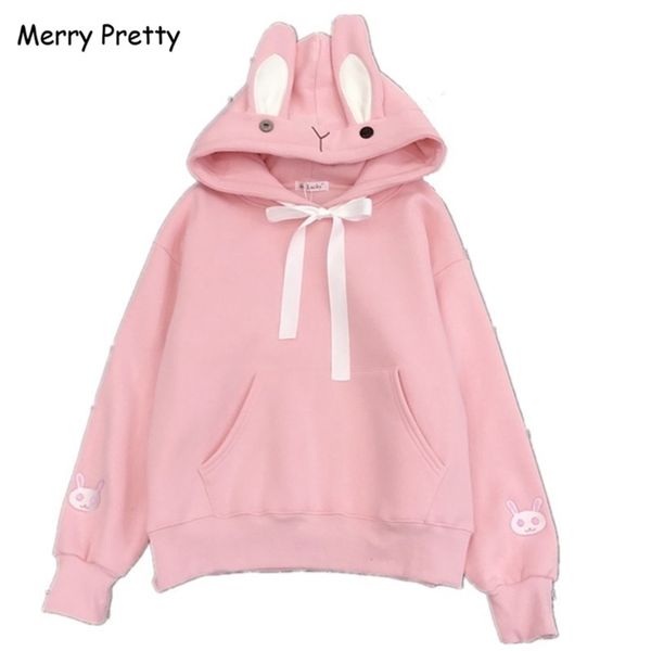 merry pretty kawaii sweet rabbit ears hooded sweatshirt women harajuku cartoon embroidery hoodies tracksuits moletom pullovers 201210, Black
