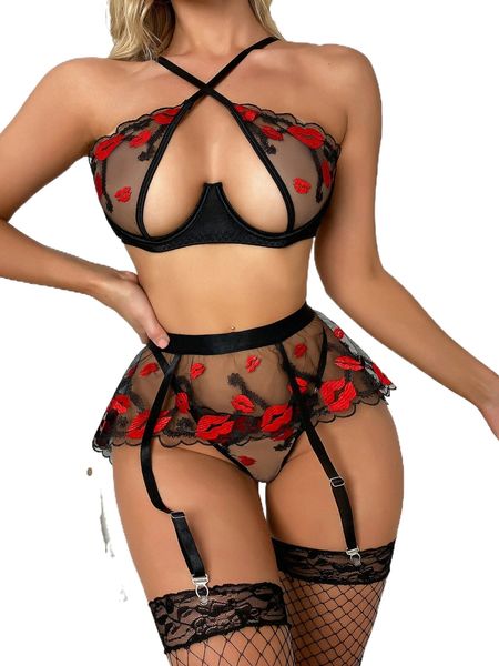 mesh cut-out underwire garter lingerie set with 1pair stockings k3ku#, Black;red