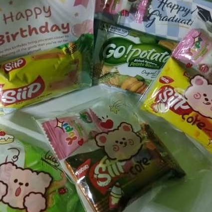 Setiap paket dilengkapi dengan kartu ucapan Happy Birthday atau Happy Graduation yang membuat hadiah ini semakin personal dan bermakna. Desain kemasan transparan, rapi, dan dihias stiker karakter lucu, cocok untuk teman, sahabat, atau keluarga tercinta!