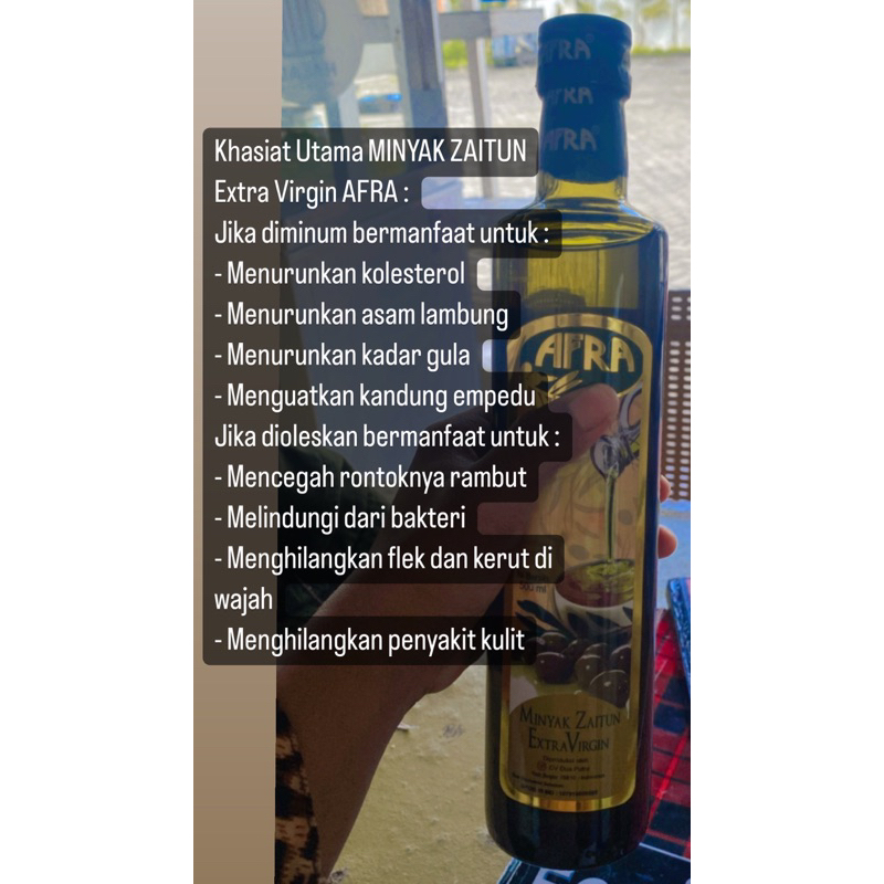 AFRA merupakan minyak zaitun extra virgin (minyak perawan) yang dihasilkan dari