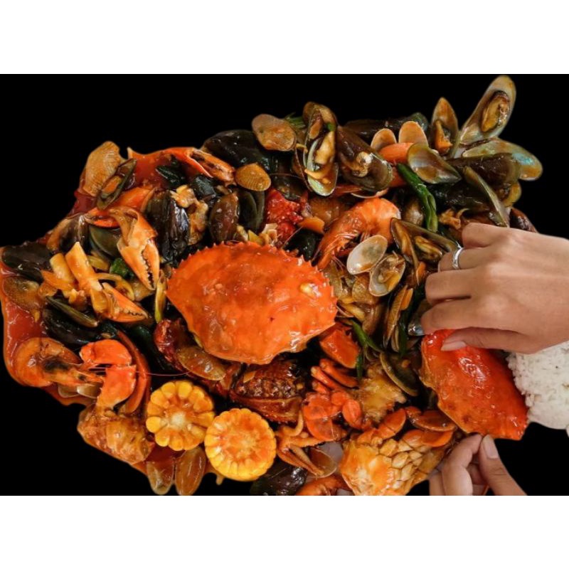isi 2 ekor kepiting + kerang hijau + kerang dara + udang + jagung . pilihan saus : saus asam manis , saus BBQ , saus Padang (pedas bisa disesuaikan)