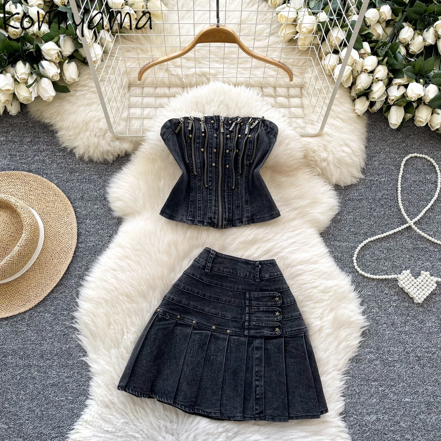 Woman Summer 2025 New Denim Sets Rivet Zipper Sleeveless Strapless Ropa Mujer High Waist Pleated Mini Skirt Hot Girls Set