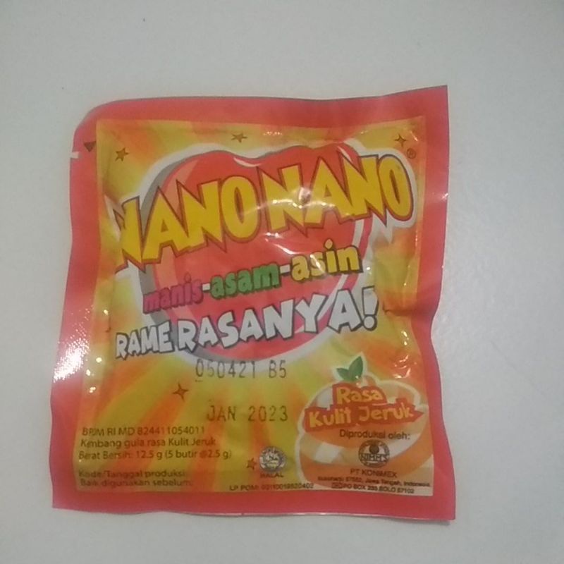 komposisi;gula,sirup glukosa, garam, pengatur keasaman asam sitrat, lemak nabati (mengandung anti oksidan Alifa tokoferol), perisa sintetik kulit jeruk ( mengandung pewarna alami kelas lV dan pengawet sulfur Dioksida), Pewarna sintetik (tartazin Cl,No.19140, kuning FCF, No. 15985)
