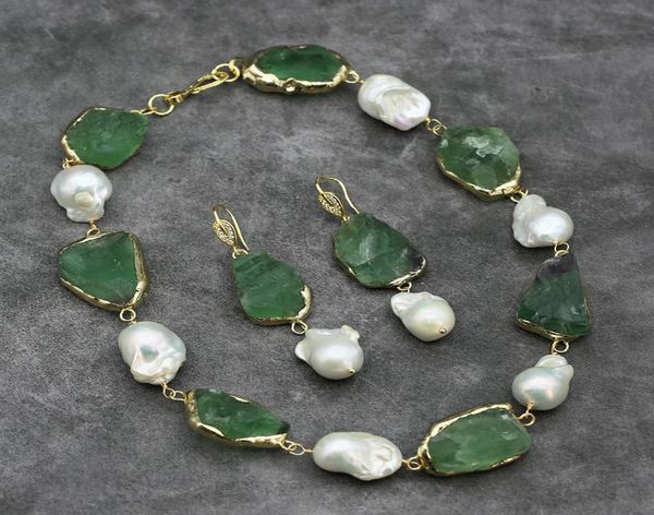 natural green fluorite rough raw real white keshi pearl necklace earrings sets handmade for lady gifts2460130, Silver