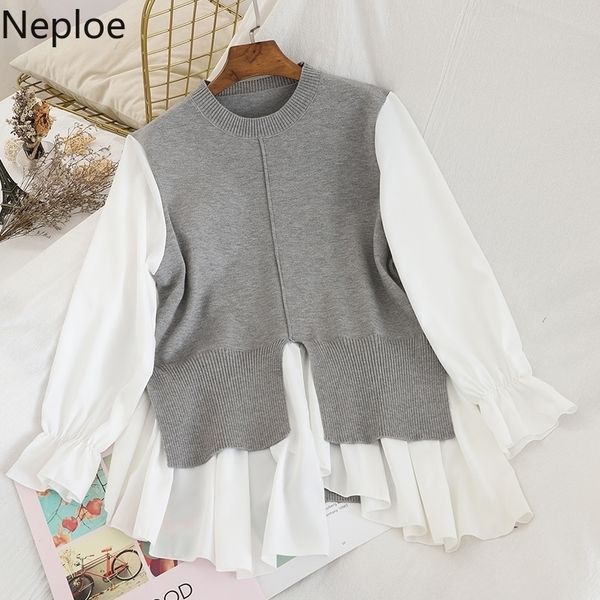 neploe medium-long blouse patchwork sweater autumn winter fashion knitted jumpers fake two pieces pullover knitwear 56298 201109, White;black