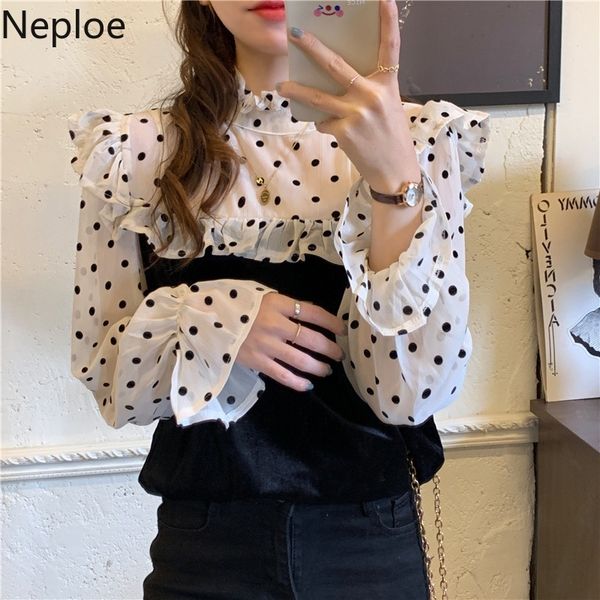 neploe women blouses patchwork polka sweet ruffles shirt korean blouse stand neck flare sleeve blusas femme 4h138 210422, White