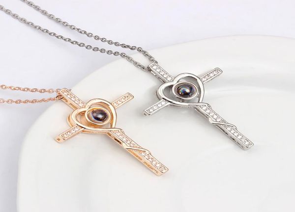 new 100 languages i love you projection necklaces for women girlfriend crystal cross pendant romantic love memory wedding jewelry4041943, Silver