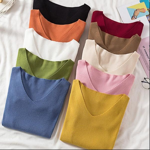 new 2021 women sweater autumn long sleeve pullover basic fashion v neck elastic female winter solid knitted jumper, White;black