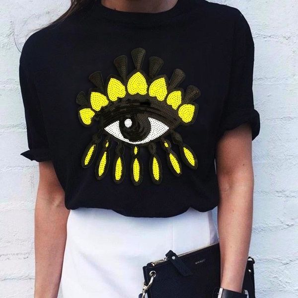 new brand spring summer fashion loose rad lips eye cat tee shirt embroidered sequins t-shirt girl tee leisure code y200109, White