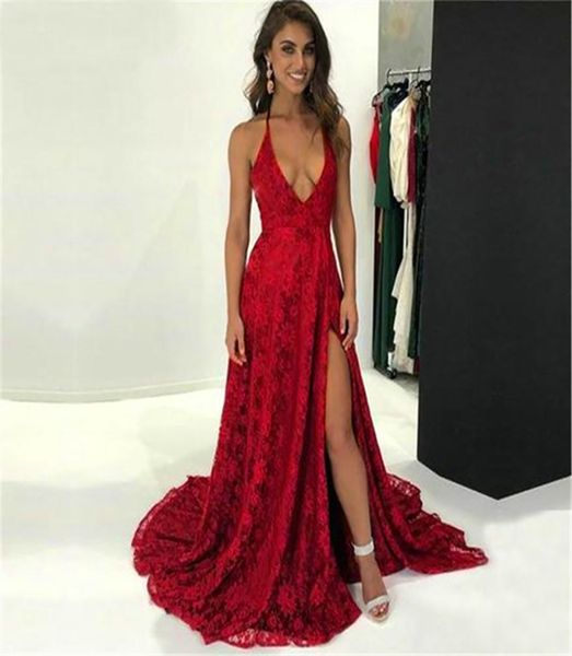 new burgundy evening dress lace high split backless halter a line long formal dresses evening gown gowns5758050, Black;red