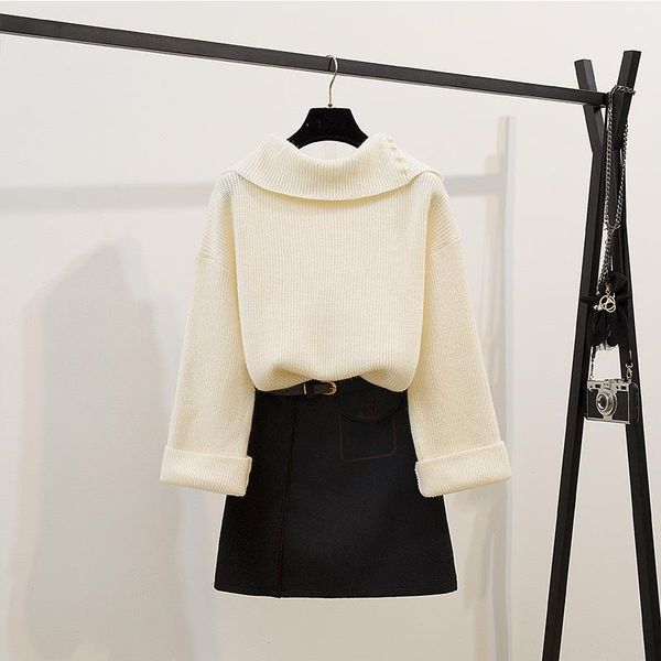 new fashion women winter lady suits a-line set loose-fit lazy-style turtle-neck woolen thicker autumn sweater skirt women's suit1, White