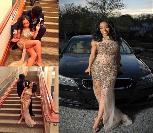 new gold bling bling side split evening dresses 2019 illusion bodice major beading bateau neck crystals sweep train prom gown2065743, Black