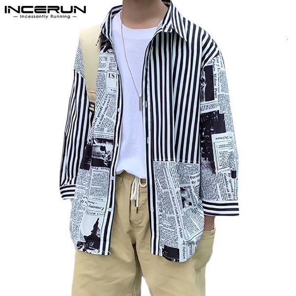 new incerun men shirt print striped patchwork lapel 3/4 sleeve loose 2021 streetwear korean fashion casual shirts camisa s-5xl tryw, White