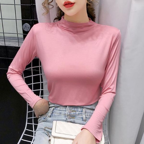 new korean style spring womens t-shirts fashion turtleneck design high elastic modal fabric oversize slim cozy base female, White