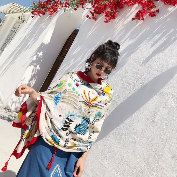 new lady temperament cotton scarf national style printing dual-use long large shawl lady travel beach sunscreen tassel scarf bib, Blue;gray