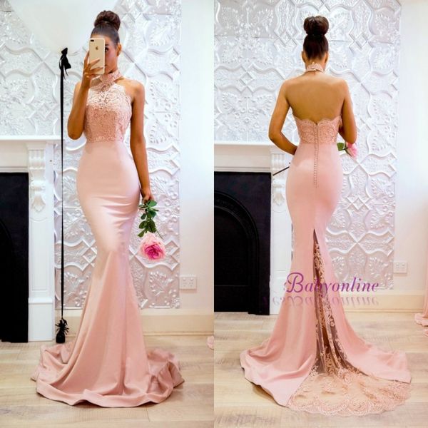 new mermaid halter bridesmaid dresses open back appliques sweep train long maid of honor gowns wedding guest dress formal, White;pink