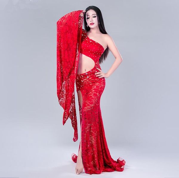 new one piece lace dress oreintal dance costume shoulder out long skirt with veil dancer performance wear red royal blue, Black;red