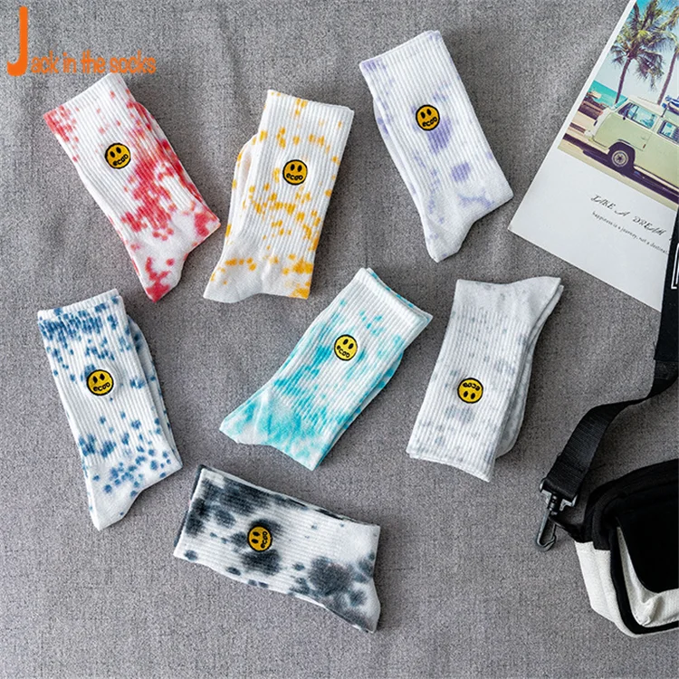 Embroidery Custom Logo Paint-Splashing nk Style Trendy Unisex Slouch Tie Dye Sox Happy Face Tye Dye Custom Embroidered Socks