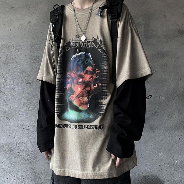 nicemix готические старые вымытые поддельные из двух частей с длинным рукавом мужчины одежды уличных контрастного цвета футболки старинных т, White;black