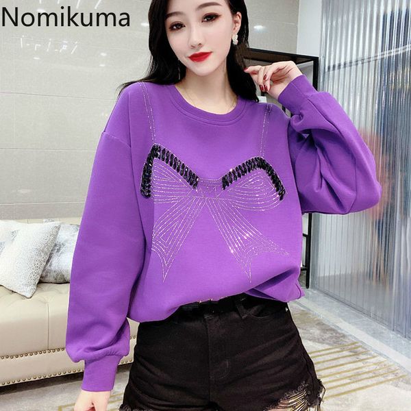 nomikuma korean beads diamond bowknot pullover sweatshirt causal long sleeve o-neck hoodie autumn winter women jumper 6d220 210427, Black
