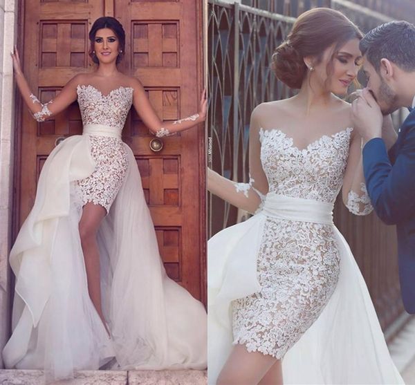 o-neck sheer long sleeve lace with tulle detachable skirt wedding dresses 2016 vestido de noiva beach bridal gowns, White