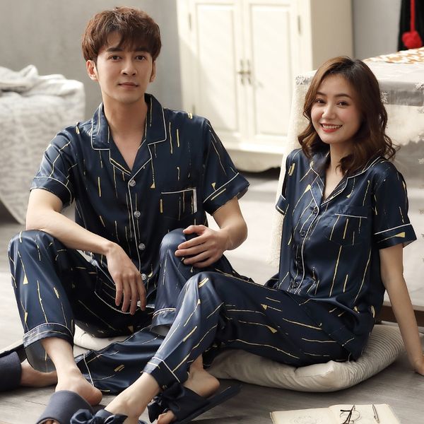 og5z7 couple summer ice silk women's short home clothes pajamas trousers pajamas sleeve thin silk men's summer home clothes trouse, Blue;red