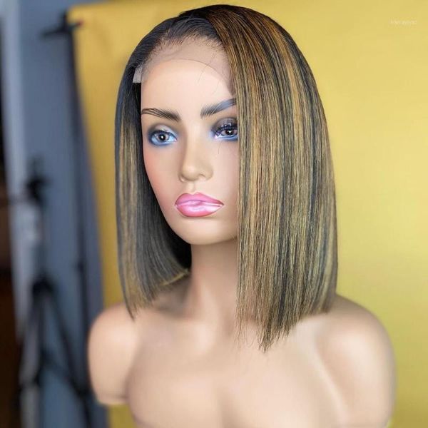 ombre highlight wig 2x6 hd transparent lace front straight bob brown honey blonde short front1, Black;brown