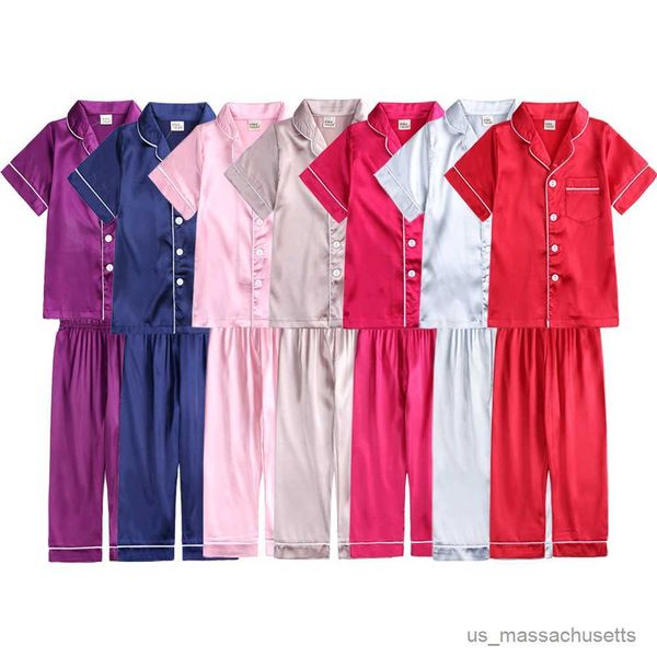 pajamas silk boys girls pyjamas sets solid pajamas clothes spring buttons kids sleepwear child christmas, Blue;red