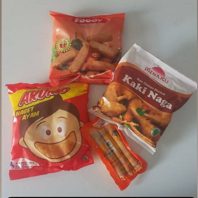 nugget ayam 250gram, minako kaki naga 200 gram, foody tempura 200gram, sosis ayam isi 3