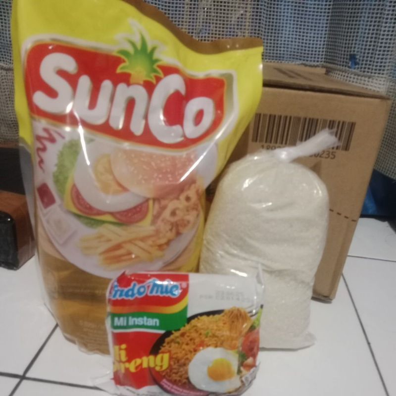 minyak sanco 2lt, gula pasir 1kg,mie goreng 1pics